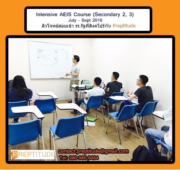 ข่าวดีสำหรับน้องๆที่จะเตรียมสอบ AEIS 2016 เข้าเรียนต่อรร.รัฐบาลสิงคโปร์ระดับ Secondary 2 และ Secondary 3 เดือนกันยายน นี้นะคะ ศูนย์ Preptitude จัดคลาส “Intensive AEIS เพื่อเน้นฝึกทำโจทย์โดยเฉพาะ” โดยสอนครอบคลุมทั้ง 3 ส่วน Maths, English & Aptitude...