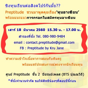 ศูนย์ Preptitude จะจัดแนะแนวเรื่องทุนอาเซียนและการกรอกใบสมัครทุนอาเซียน (ASEAN Scholarships 2018) วันที่ 18 มี.ค.60 เวลา 15.30 น. – 17.00 น. โดยเป็นกิจกรรมฟรี ไม่มีค่าใช้จ่าย