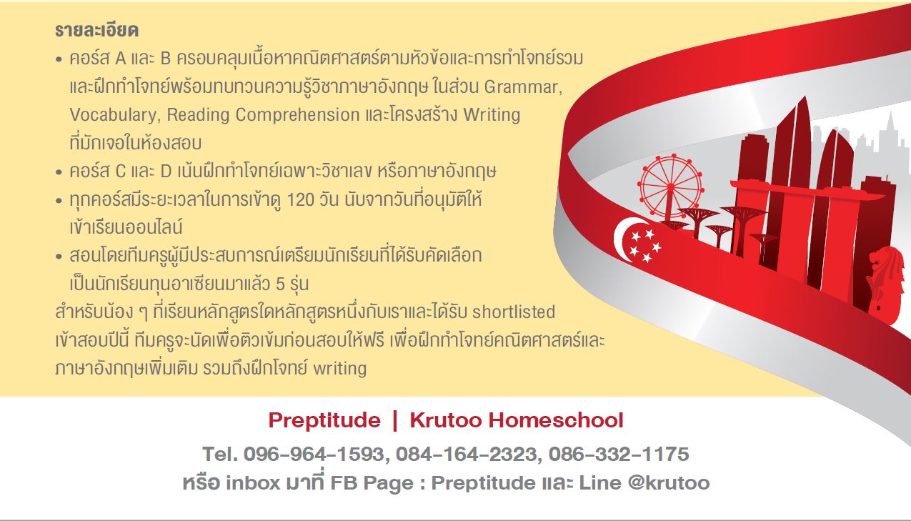 สอบถามข้อมูลเพิ่มเติมได้ที่ Preptitude และ Krutoo Homeschool : Tel. 096-964-1593, 084-164-2323, 086-332-1175 หรือ คลิ๊กที่นี่ เพื่อส่งคำถามไปที่ inbox ของ Facebook Page: Preptitude