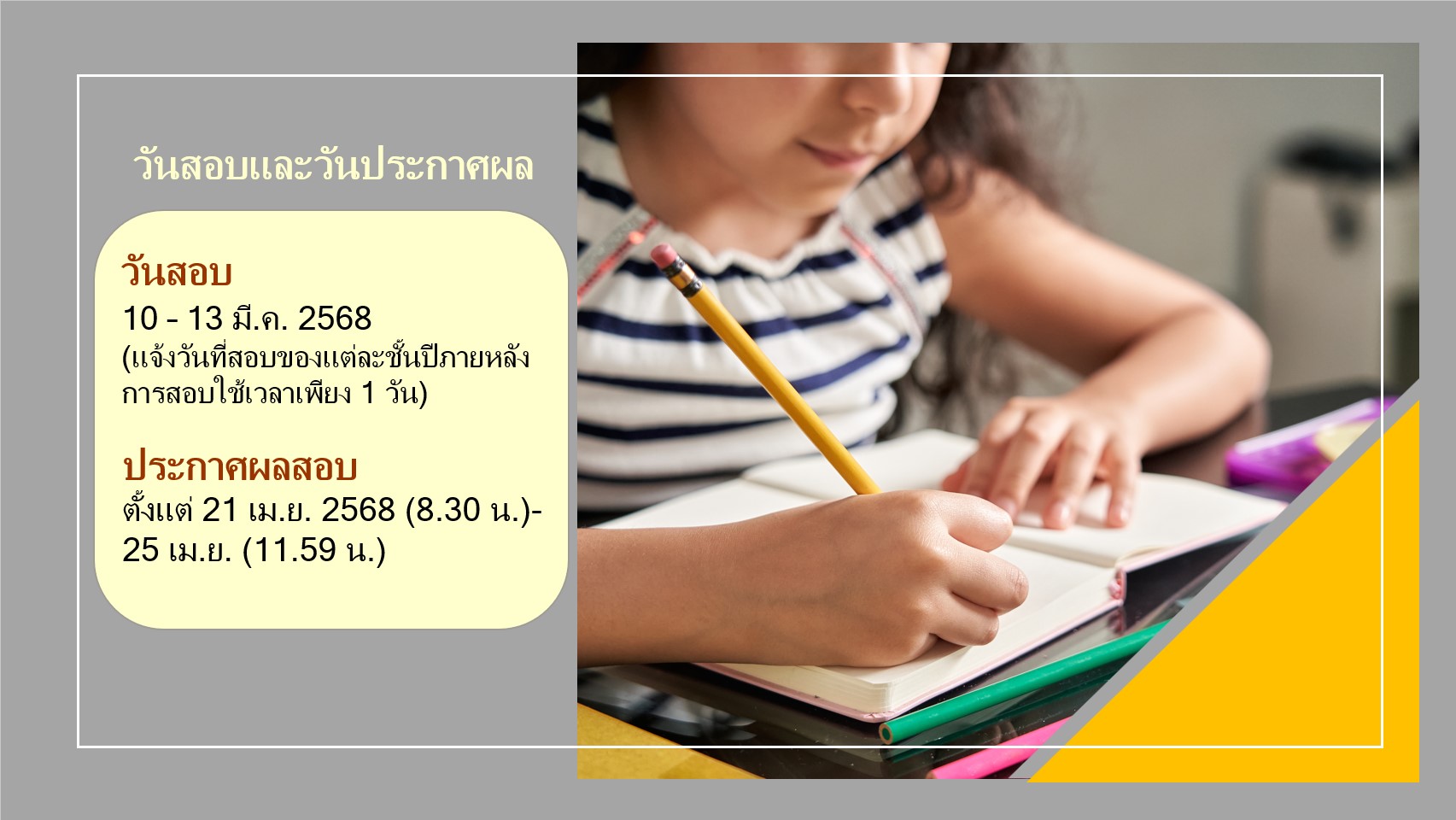 - ประกาศผลสอบ (online) : 21 เม.ย. 2568 (8.30 น.)- 25 เม.ย. (11.59 น.)
