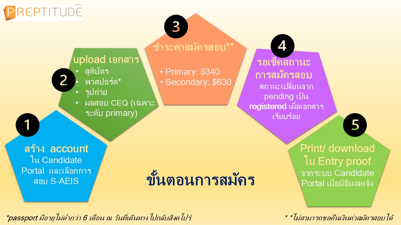 สามารถสมัครสอบ online ได้ทางเวบไซต์ของ MOE และส่งเอกสารสำคัญไปให้ที่สิงคโปร์ โดยดูรายละเอียดได้จาก https://www.moe.gov.sg/international-students/s-aeis/apply