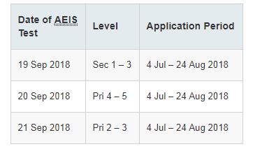 AEIS 2018 จะเริ่มรับสมัครวันที่ 4 กรกฎาคม 2561 -24 สิงหาคม 2561 และจัดสอบวันที่ 19 กันยายน 2561 (ระดับ Sec 1-3) วันที่ 20 กันยายน 2561 (ระดับประถม 4-5) และ 21 กันยายน 2561 (ระดับประถม 2-3) หากสอบผ่านจะได้เข้าเรียนภาคการศึกษาแรกเดือน มกราคม 2562 (อ่านเกี่ยวกับ AEIS เพิ่มเติมที่นี่) โดยการสอบ AEIS นี้จัดสอบเป็นประจำทุกปีที่ประเทศสิงคโปร์