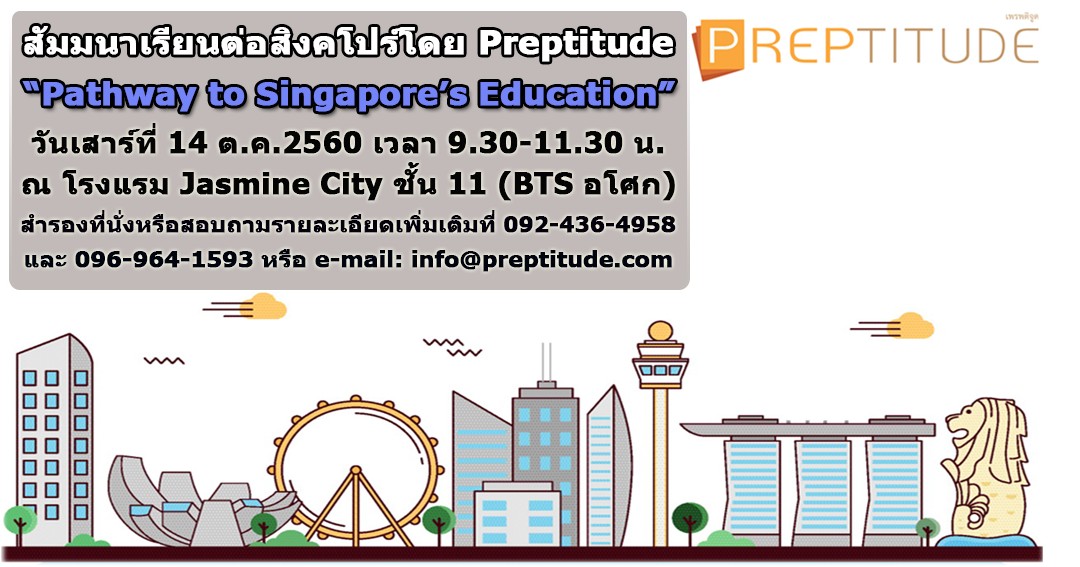 ศูนย์ Preptitude ขอเชิญผู้ปกครองและน้องๆ ที่สนใจเข้าร่วมสัมมนาในหัวข้อ “Pathway to Singapore’s Education” เพื่อทำความเข้าใจถึงระบบการศึกษาของประเทศสิงคโปร์ ประเทศที่ได้ขึ้นชื่อว่ามีระบบการศึกษาที่ดีที่สุดในโลกแห่งหนึ่ง งานครั้งนี้ จะพิเศษกว่างานสัมมนาครั้งอื่นตรงที่เราจะพูดคุยถึงระบบการศึกษาโดยรวมของสิงคโปร์และการเรียนต่อตั้งแต่ระดับประถมไปจนถึงมหาวิทยาลัย