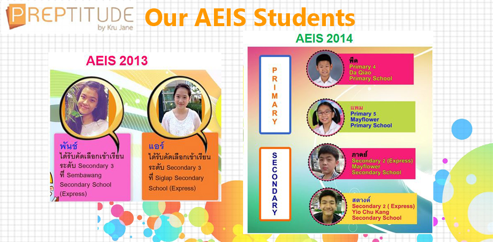 Preptitude by Kru Jane เปิดสอน AEIS และหลักสูตร ASEAN Scholarship เพื่อเตรียมความพร้อมน้องๆเข้าเรียนต่อที่โรงเรียนรัฐบาล ประเทศสิงคโปร์ ไม่ว่าจะผ่านทางการสอบ หรือผ่านการสอบชิงทุนอาเซียน โดยที่ผ่านมา เรามีนักเรียนสอบติด รร.รัฐบาลที่สิงคโปร์ และปัจจุบันกำลังศึกษาอยู่ที่สิงคโปร์ในระดับประถมและมัธยมศึกษา