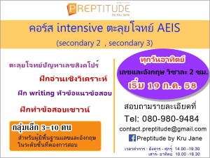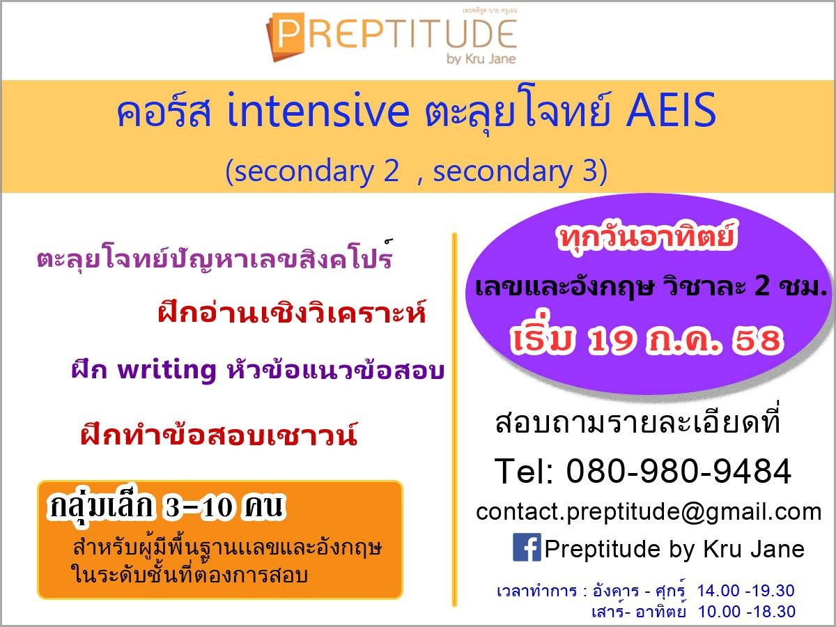ศูนย์ Preptitude เปิดคอร์ส intensive สำหรับน้องๆ ที่จะไปสอบในระดับ secondary 2 และ secondary 3 โดยจะเน้นทำโจทย์เป็นหลัก เรี่ยนทั้งเลขและอังกฤษ วิชาละ 2 ชม./ ครั้ง