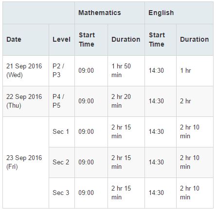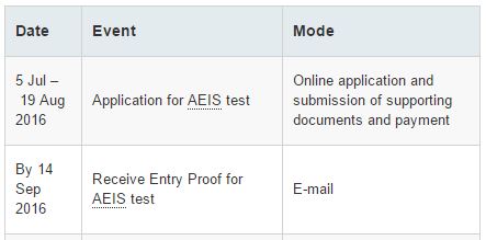 AEIS 2016 เพื่อเรียนต่อโรงเรียนรัฐบาลที่สิงคโปร์ จะเริ่มรับสมัครวันที่ 5 ก.ค. -19 ส.ค. 2559 และจัดสอบ 21-23 ก.ย. 2559 แบ่งตามระดับชั้นดังนี้