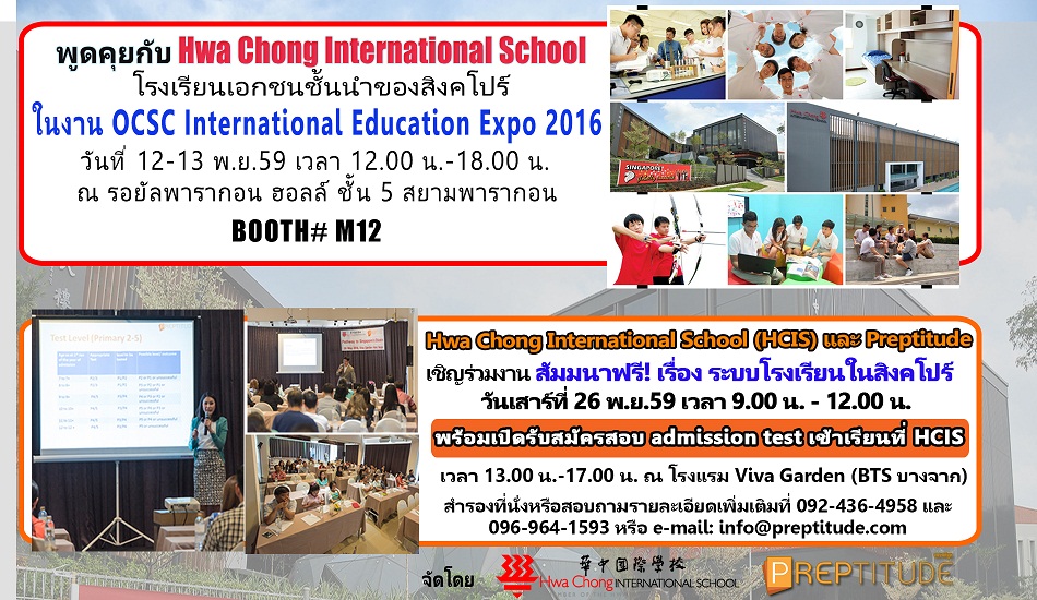 ศูนย์ Preptitude ร่วมกับ Hwa Chong International School (HCIS) ซึ่งเป็นโรงเรียนเอกชนชั้นนำของประเทศสิงคโปร์ ขอเรียนเชิญผู้ปกครองและน้องๆ นักเรียนที่สนใจในระบบการศึกษาของประเทศสิงคโปร์เข้าร่วมกิจกรรมพิเศษกับเราตลอดเดือน พ.ย.59 นี้ ได้แก่